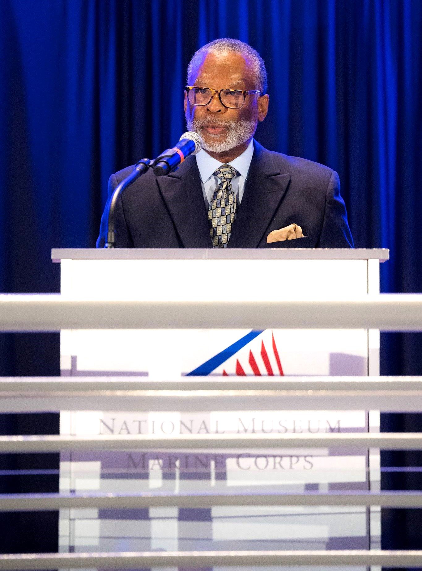Left: Dexter Montgomery addresses the 2025 Make Your Mark Event at the National Museum of the Marine Corps
